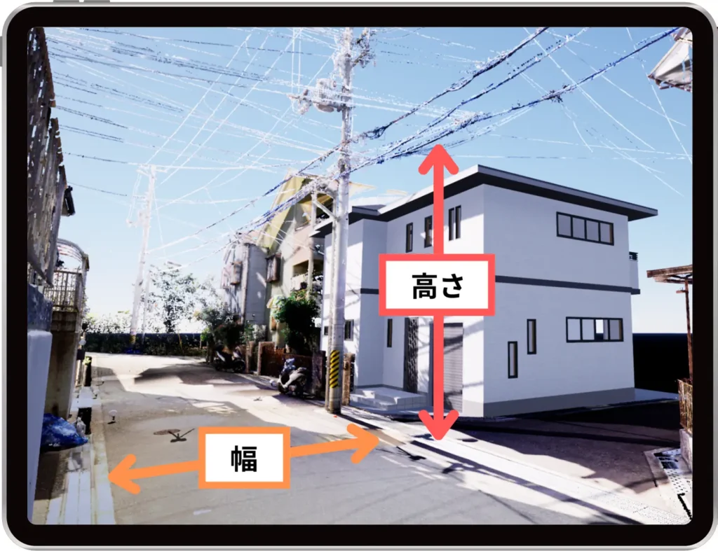 何度も現場に⾏かずに搬⼊路・電線・⾼低差をタブレットで計測できます!
