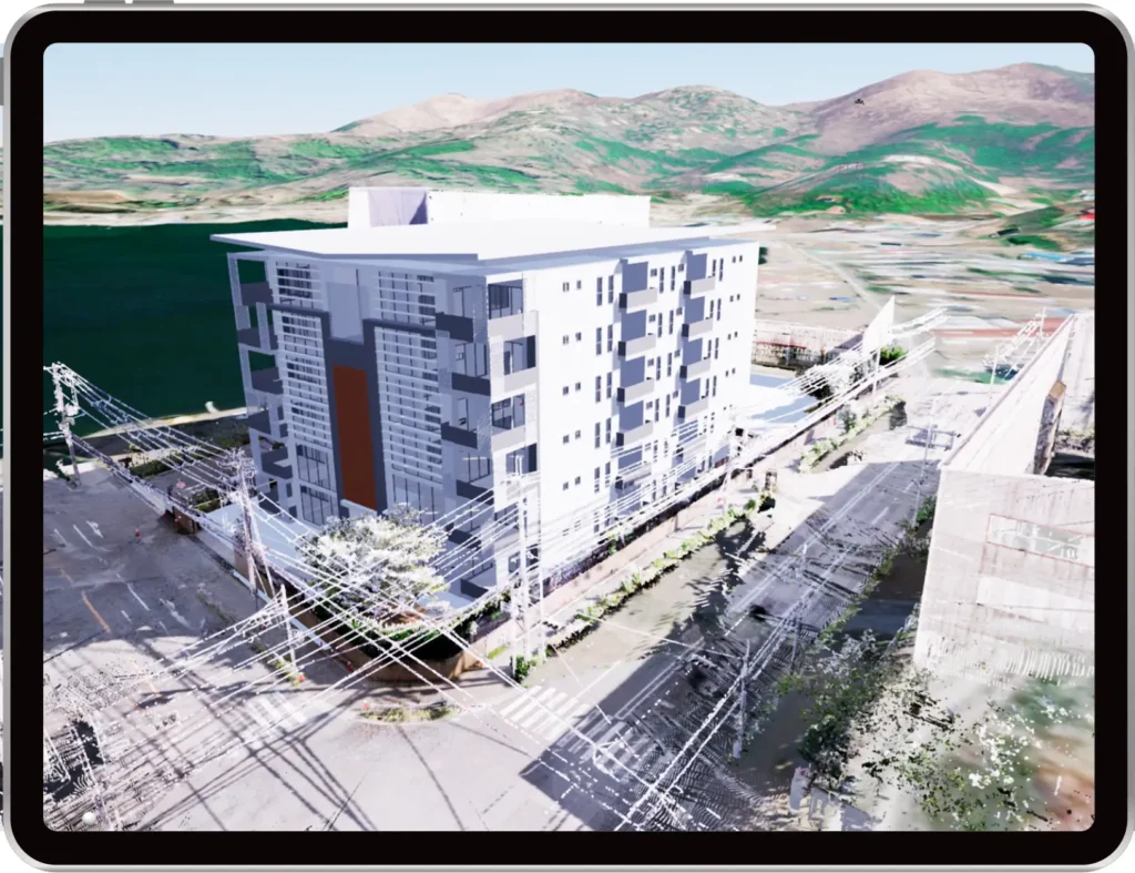 点群データにより敷地全体を3Dで正確に再現。搬入路、電線、高低差などの現場情報をタブレットまたはスマートフォン、PC上で正確に計測・確認でき、現場への移動コストを大幅に削減します。